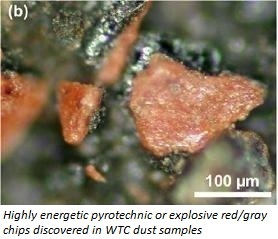 “No hay razón para que los chips rojos estén en este polvo”, señala un artículo de Arquitectos e Ingenieros por la Verdad del 11/9 referente a las muestras, y no pudo haber sido formado naturalmente por el impacto de los aviones ni por el colapso de las torres, a no ser que un alto explosivo pirotécnico haya sido utilizado para implosionar los edificios.