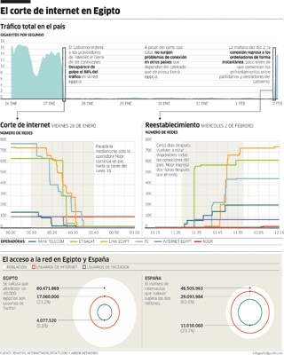 Una línea estratégicaSólo Noor, una de las operadoras más pequeñas, permanece en pie tras esa noche. De esta, que también caerá el lunes 31 por la tarde, dependen servicios esenciales para el Estado como la Agencia de Crédito, la Bolsa, el consorcio que suministra tecnología a la aviación egipcia y la propia Egypt Air. Según los expertos consultados, se esperó a tener a salvo esos servicios mediante líneas discretas, no accesibles a la población, para tirar la red, por la que todavía se colaban portavoces de la insurrección y las crónicas de la prensa.