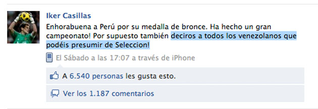 Madrid, julio 25 - La actuación de la Vinotinto en la Copa América encendió el país con alegría y apoyo a los muchachos que mostraron su garra y el crecimiento en su juego. Al parecer, esto también llamó la atención del jugador español Iker Casillas, portero estelar de la selección de fútbol de España, campeona actual del Mundial de la especialidad.