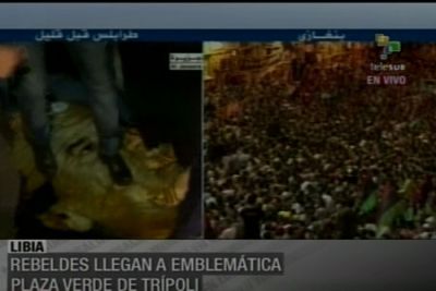La televisión internacional mostró imágenes de las celebraciones en el lugar y otras calles, donde seguidores levantas banderas con los colores del llamado Consejo Nacional de Transición (CNT) y pisando afiches con la fotografía del líder libio.