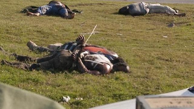 La historia de AP indica que virtualmente todas las víctimas son trabajadores inmigrantes inocentes y no lucharon por Gaddafi, pero los mercenarios rebeldes todavía están deteniéndolos e internándolos en estadios deportivos y otros campamentos de prisioneros simplemente por su color de piel.