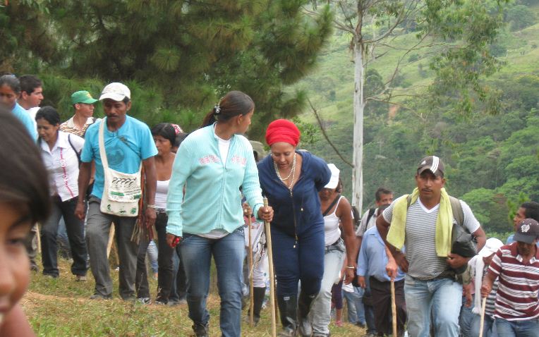 4 de julio de 2012.-Nutrida jornada del Movimiento Marcha Patriótica en solidaridad con labriegos de la vereda Calandaima, en las montañas del municipio de Miranda, norte del Cauca. Pobladores afectados por la guerra exigen el retiro de tropas del Ejército de sus entornos.