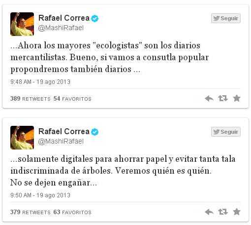 “Ahora los mayores 'ecologistas' son los diarios mercantilistas. Bueno, si vamos a consulta popular propondremos también diarios solamente digitales para ahorrar papel y evitar tanta tala indiscriminada de árboles. No se dejen engañar", afirmó Correa en la referida red social.