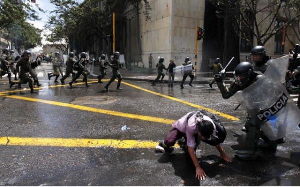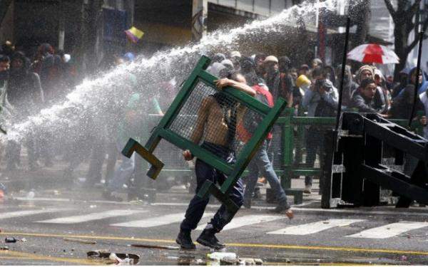 29 agosto 2013 - La policía colombiana dispersó hoy con gases lacrimógenos y chorros de agua a miles de manifestantes que se habían congregado en la Plaza de Bolívar, en el centro de Bogotá, en apoyo a la huelga del sector agropecuario.