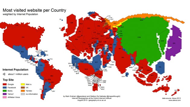 3 oct. 2013 - EE.UU. y Australia prefieren Google, el norte de África a Facebook, China a Baidu y Rusia a Yandex, según el recuento de los científicos de Oxford que han creado el primer mapa mundial a partir de los gustos de los internautas.