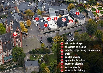La residencia del obispo, cuyo precio se multiplicó de repente por tres respecto de los 10 millones de euros planeados, incluye oficina del obispo, vivienda para las monjas, sala de recepciones y conferencias, atrio, capilla privada, vivienda privada del obispo, museo de diócesi y parque privado, además de la catedral de Limburgo.