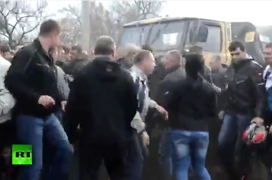 9 abril 2014 - En el sureste de Ucrania, en los suburbios de las ciudades de Donetsk y Lugansk, la gente forma barreras humanas para obstaculizar el paso de pertrechos militares enviados por Kiev para aplacar las manifestaciones en estas regiones.