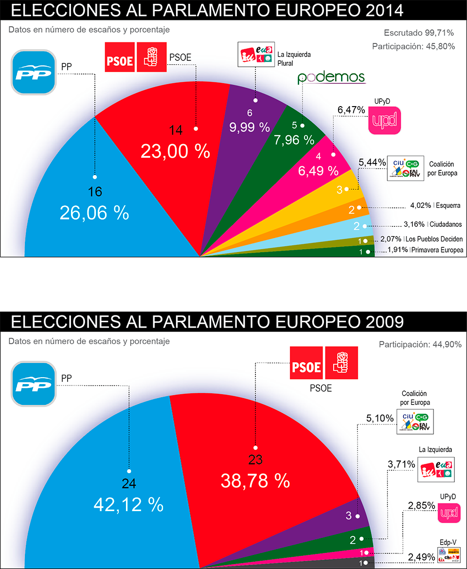 25 mayo 2014 - Por primera vez, los dos grandes no alcanzan el 50% de los votos emitidos. El PP cae ocho escaños hasta los 16 y el PSOE se queda con 14. La Izquierda Plural roza el 10% de los votos y llega a los 6 diputados e irrumpe Podemos al obtener 5 escaños y más de 1,2 millones de sufragios.