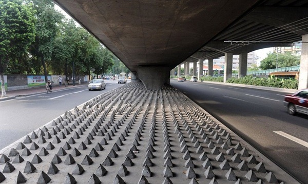 15-06-14.-Mientras en Londres sigue la polémica por los misteriosos pinchos de metal colocados en los portales de las viviendas más lujosas, para evitar que los sin techo pernocten en la zona, muchos kilómetros más allá utilizan un método más expeditivo a la hora de evitar el descanso de los sin techo. Ni siquiera debajo de los puentes. Por ejemplo, la administración de la ciudad de Cantón (Guangzhou) es de las que piensan que las personas sin hogar que duermen bajo estas estructuras viales afean la imagen de una urbe con más de 13 millones de habitantes.