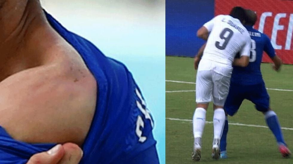 Tal como lo había hecho el año pasado con el defensor del Chelsea Branislav Ivanovic, el ‘Pistolero’ estuvo forcejeando en una jugada con el zaguero Giorgio Chiellini. Pero cuando parecía que todo quedaba en un par de empujones, Suárez mordió al italiano.