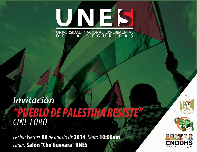 La Universidad Nacional Experimental de la Seguridad invita al Cine Foro: “Palestina Resiste” que se llevará a efecto el día de hoy viernes 8 de agosto, a las 10 am, en el Salón "Che Guevara" en los Flores de Catia (Antiguo Reten de Catia hoy UNES).