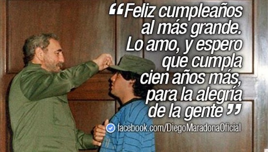 La Habana, agosto 13 - “Feliz cumpleaños al más grande. Lo amo, y espero que cumpla cien años más, para la alegría de la gente”, dijo en su página en la red social Facebook Diego Armando Maradona hoy en su mensaje al líder de la Revolución cubana Fidel Castro.