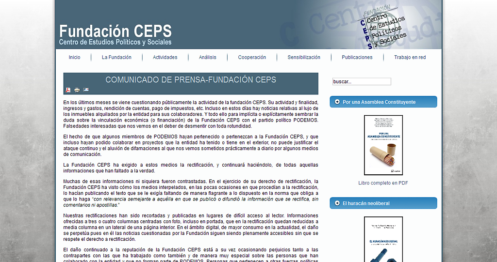 En los últimos meses se viene cuestionando públicamente la actividad de la fundación CEPS. Su actividad y finalidad, ingresos y gastos, rendición de cuentas, pago de impuestos, etc. Incluso en estos días hay noticias relativas al lujo de los inmuebles alquilados por la entidad para sus colaboradores. Y todo ello para implícita o explícitamente sembrar la duda sobre la vinculación económica (o financiación) de la Fundación CEPS con el partido político PODEMOS. Falsedades interesadas que nos vemos en el deber de desmentir con toda rotundidad.