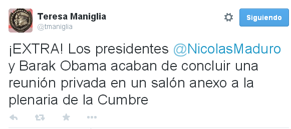 Así lo señaló la periodista Teresa Maniglia (Prensa Presidencial) a través de un mensaje a través de su cuenta en Twitter @tmaniglia, en la que también señaló: Los presidente @NicolasMaduro y Barak Obama se saludaron en castellano. Entre ambos hubo mucho respeto, verdades y cordialidad.