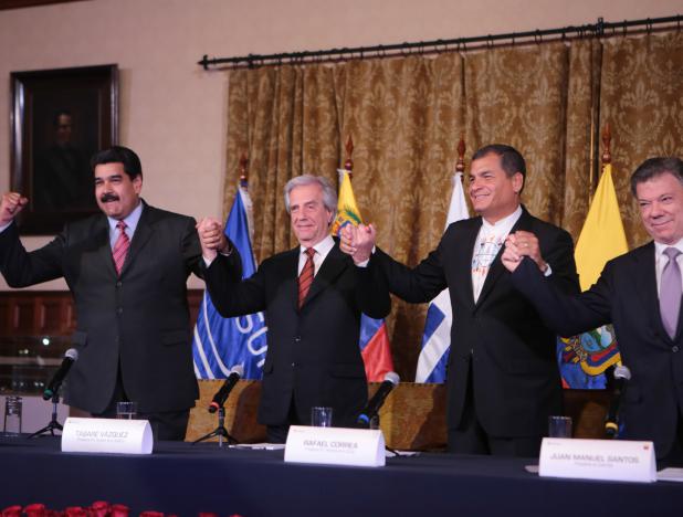 En el salón de los banquetes de la presidencia ecuatoriana, la mesa se dispuso para Santos y Maduro en cada esquina, y los mediadores, Correa y el presidente de Uruguay, Tabaré Vázquez, en el centro, tras un encuentro del cual apenas si hay fotos y, ni por asomo, un apretón de manos entre Maduro y Santos.