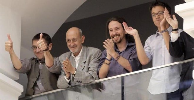 Los líderes de Podemos Pablo Iglesias (2-d), Íñigo Errejón (d) y Juan Carlos Monedero (i) y el secretario general de la formación en la ciudad de Madrid, Jesús Montero, aplauden tras la elección de Manuela Carmena como alcaldesa de Madrid.- EFE
