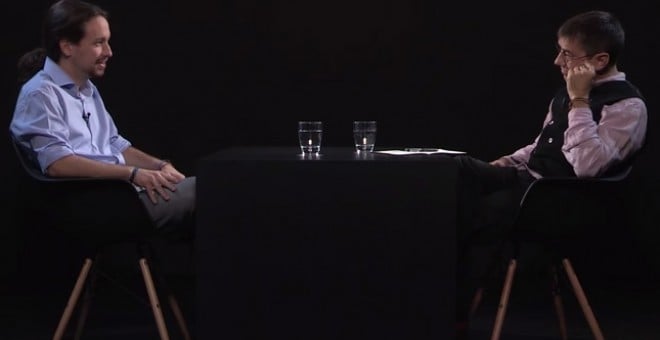 Juan Carlos Monedero (d), durante la entrevista que concedió a Pablo Iglesias para 'La Tuerka'. PÚBLICO
