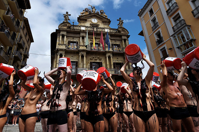 07-07-16.-Miembros de la organización no gubernamental Anima Naturalis se han concentrado en la plaza principal de la ciudad en ropa interior para pedir un "Sanfermin sin sangre" y el fin de la tauromaquia.