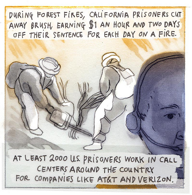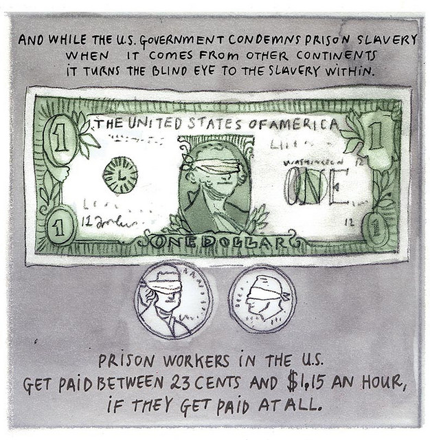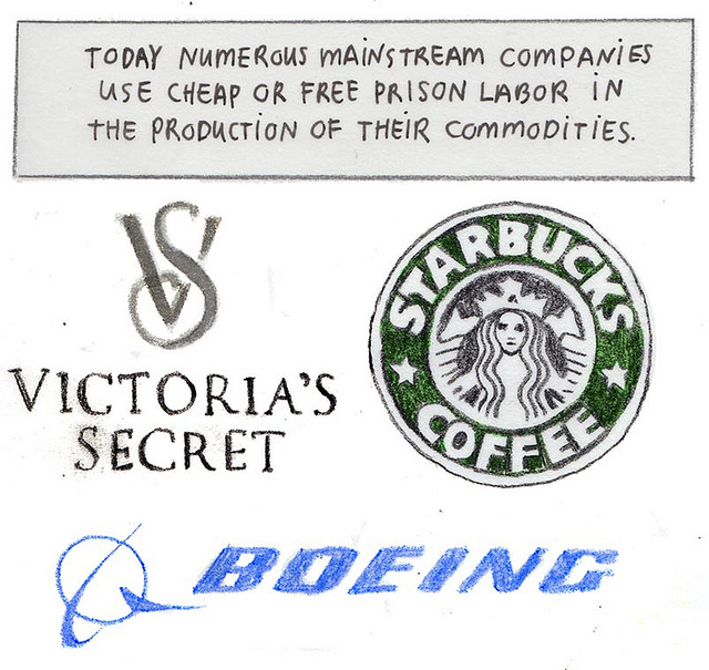 Las empresas han aprendido que pueden sacar enormes beneficios a partir de la esclavitud en prisión. Antes externalizaban trabajo a China, India o México y se beneficiaban de pagar bajos salarios en esos países, ahora esas mismas compañías están externalizando esos trabajos dentro del país a través de las prisiones. Dado que los presos son considerados "bajo custodia" del Estado, las empresas no tienen que pagar seguros sociales, ni impuestos, ni preocuparse de un trabajador si tiene un accidente laboral. Todos los asuntos laborales son gestionados por la administración de la cárcel. Negarse a trabajar puede resultar en una condena más larga, confinamiento en solitario u otras restricciones. Las empresas tienen una mano de obra capacitada a la que sólo tienen que pagar centavos por hora y dentro de su país... Con la desindustrialización de este país, la respuesta de los estados para controlar a la gente ha sido el encarcelamiento masivo. Afecta, de manera desproporcionada, a la gente de color. Teniendo una enorme masa de trabajadores a los que apenas se les paga, existe la amenaza al grueso de los trabajadores americanos de que si no son dóciles podrían perder el empleo para externalizarlo a la población reclusa... Para que esa inversión funcione, la empresa tiene que tener garantizado que el trabajo esté disponible a largo plazo. Para ello, los políticos suelen aprobar leyes como el "mínimo obligatorio", la "ley de tres huelgas", y todo tipo de sentencias por tenencia de drogas menores… El resultado es que existe un encarcelamiento masivo en EEUU, en condiciones deplorables, abusos… y los beneficios se mantienen muy elevados...
