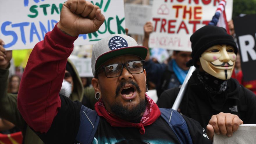Los manifestantes durante su marcha expresaron su preocupación por los polémicos proyectos que con sus desafíos medioambientales amenazan el suministro de agua y los sitios sagrados de los indígenas locales.