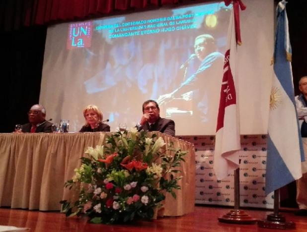 La rectora de la UNLa, Ana Jaramillo, destacó que esta universidad concedió el Doctorado Honoris Causa Post Mortem al Comandante Hugo Chávez Frías, con motivo de seguir los valores de integración latinoamericana, defensa de la Patria Grande, vigencia de los derechos humanos y dignidad humana como valores fundamentales presentes en esta casa de estudios universitarios.