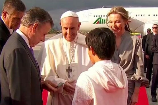 Emmanuel, el hijo de Clara Rojas, entregó la escultura de una paloma blanca al pontífice apenas unos minutos después de pisar tierras colombianas.