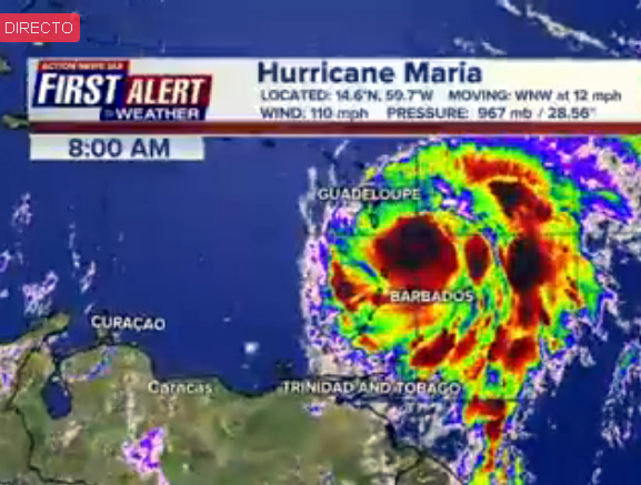 María, que presenta vientos máximos sostenidos de 120 kilómetros por hora, se dirige hacia las Antillas Menores y Puerto Rico con una velocidad de traslación de 24 kilómetros por hora.