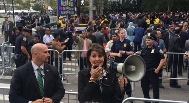 Nueva York, septiembre 28 - "¡Continuaremos luchando por los venezolanos hasta que Maduro se vaya!", gritó megáfono en mano la embajadora estadounidense ante la ONU, Nikki Haley, a un grupo de venezolanos que manifestaban contra el presidente de su país este jueves frente a Naciones Unidas.