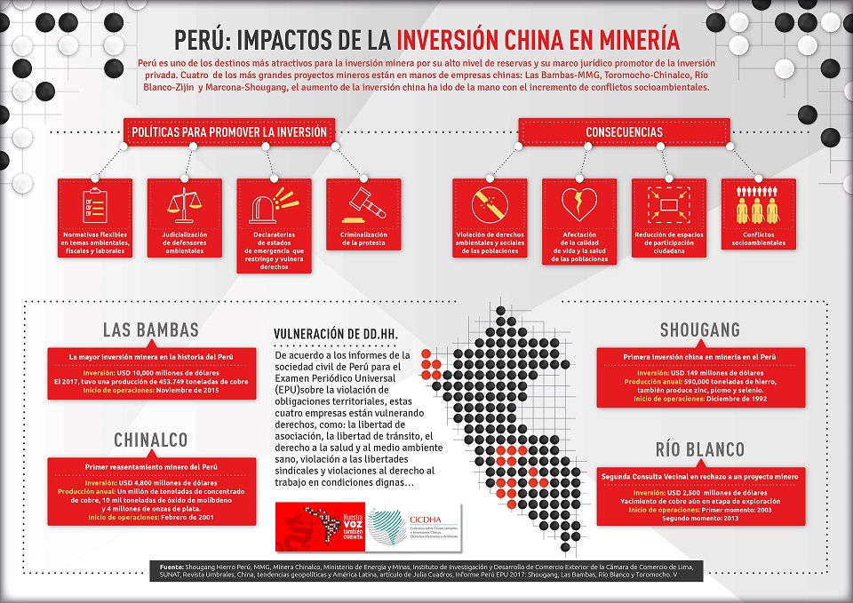 En el marco del tercer Examen Periódico Universal de China, EPU, que se realizará en Ginebra ante la Oficina del Alto Comisionado de Derechos Humanos de la ONU el 6 de noviembre, representantes de Perú y de otros cuatro países (Argentina, Brasil, Bolivia y Ecuador) que forman parte del Colectivo sobre Financiamiento e Inversiones Chinas, Derechos Humanos y Ambiente (CICDHA), participaron en la Sesión paralela de la ONU, donde compartieron información y testimonios sobre las graves violaciones a los derechos humanos que generan 18 proyectos que operan con financiamiento chino en territorios latinoamericanos. Entre los casos expuestos están cuatro casos de empresas mineras de capitales chinos en el Perú: Las Bambas en Apurímac, Chinalco en Junín, Shougang en Ica y Río Blanco Cooper en Piura; proyectos que representan más de 17 mil millones de dólares de inversión en el Perú.