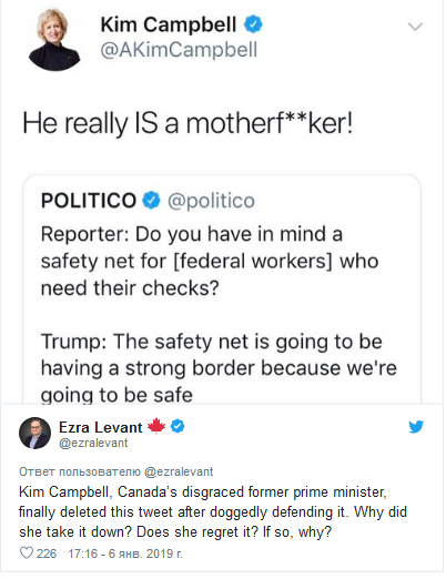 8 de enero de 2019.- La ex primera ministra de Canadá, Kim Campbell, provocó un debate sobre el lenguaje diplomático al describir el sábado al presidente de EE.UU., Donald Trump, como un "hijo de p*ta", en un tuit que más tarde borró.