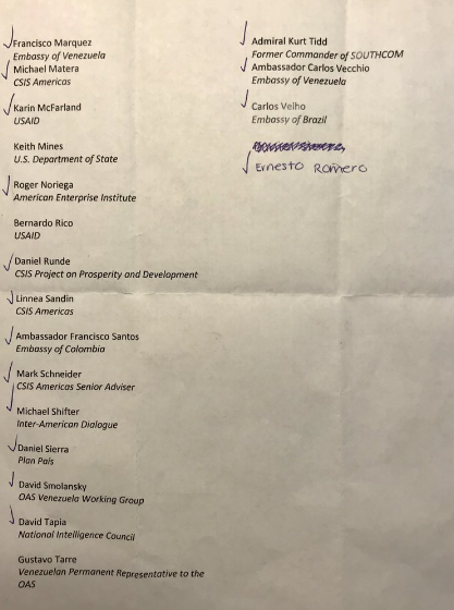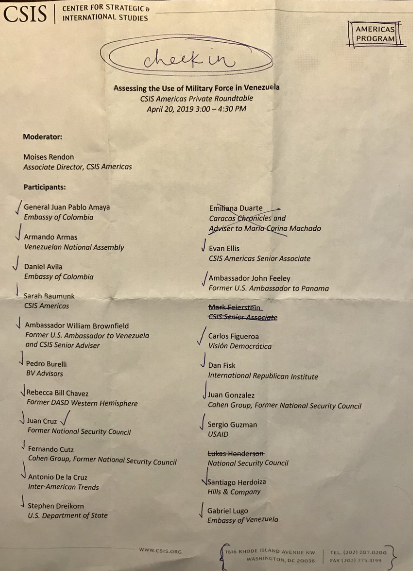 Blumenthal obtuvo una lista de verificación de participación en la mencionada mesa redonda denominada 'Evaluación del uso de la fuerza militar en Venezuela', organizada por el mencionado centro con sede en Washington D.C., que incluye a varios funcionarios y militares de EEUU y Sudamérica.