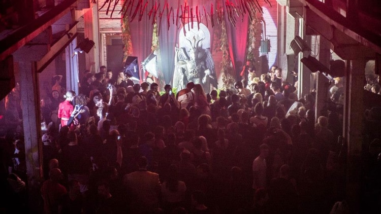 Una reunión de miembros del Templo Satánico se congregan alrededor de una estatua de Baphomet, la representación del macho cabrío alado (Foto: Facebook Satanic Temple)