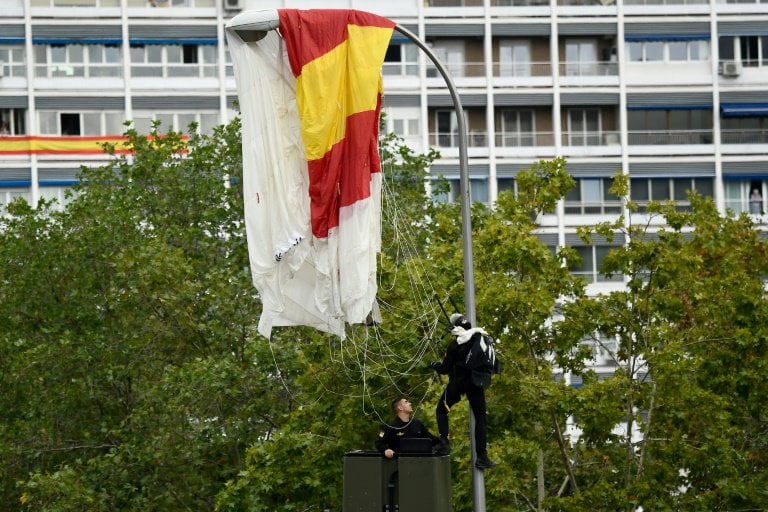 El paracaidista dejó caer la enseña española, para que fuese izada en este “día de la hispanidad” que conmemora la llegada de Cristóbal Colón a América en 1492.
