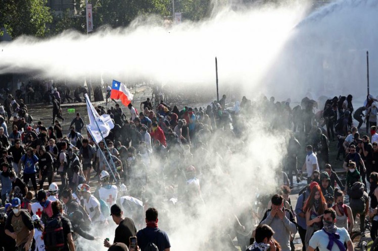 Tal contraste se apreció en la forma en que fueron reprimidos cientos de manifestantes que se habían congregado cerca del Costanera Center, el mayor centro comercial de la capital, donde las fuerzas de Carabineros emplearon carros lanza agua y bombas de gases lacrimógenos y gas pimienta contra los allí reunidos.