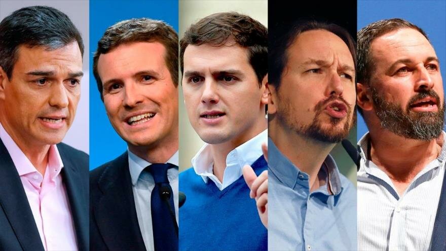 Pedro Sánchez (PSOE), Pablo Casado (PP), Albert Rivera (Ciudadanos), Pablo Iglesias (UP) y Santiago Abascal (Vox).