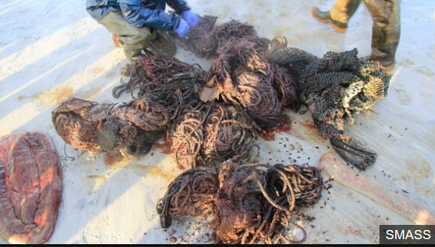 Redes de pesca, correas de embalaje, sogas, bolsas y hasta vasos de plástico fueron algunos de los objetos que descubrieron en una gigantesca masa compacta en el estómago del animal.