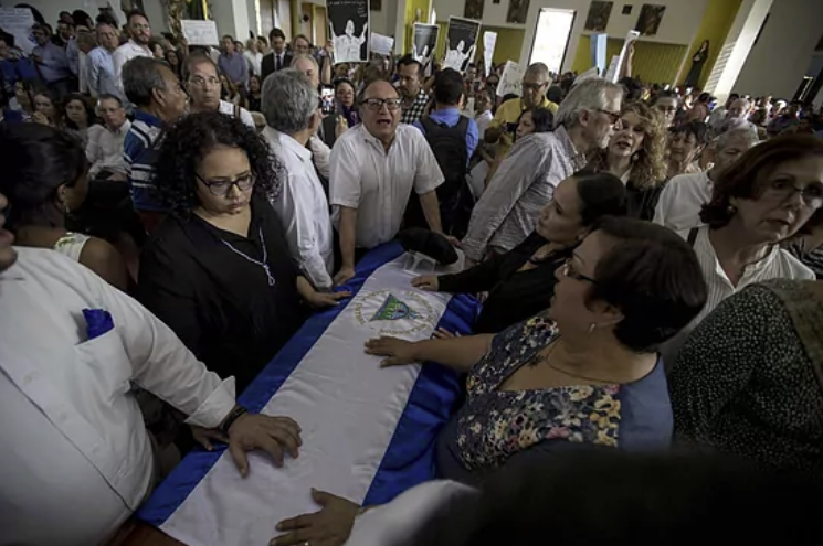 "Esta es Nicaragua en manos de una tiranía. Mandan a la pobre gente a hacer un papel ridículo. Profanaron la iglesia", dijo el escritor nicaragüense Sergio Ramírez, Premio Cervantes 2017, mientras intentaba abrirse paso entre la multitud y los gritos.