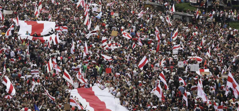 24-08-20.-Más de 100 mil personas protestaron el domingo en la capital de Bielorrusia, exigiendo la salida del autoritario líder del país a quien acusan de ganar las elecciones mediante fraude.