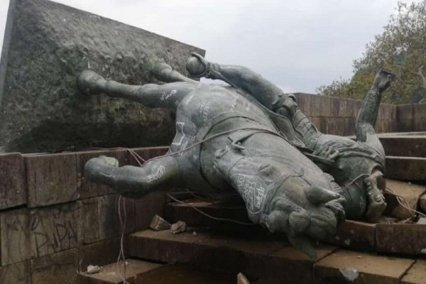 "Con la fuerza de la gente se logró derribar como acto simbólico de rechazo a tanto exterminio de los pueblos", dijo Diana Jembuel, del pueblo indígena Misak. Reseñó el portal Meganoticias.