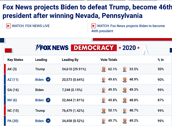 De acuerdo a las proyecciones de las agencia AP y FOX, dan a Biden 290 votos electorales.dándole así una victoria contundente sobre su oponente repúblicano Donald Trump, con Pensilvania (20 votos electorales), Arizona (11) y Nevada (6).
