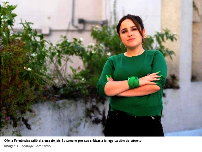 La legisladora porteña del Frente de Todos, Ofelia Fernández, salió al cruce del presidente de Brasil, Jair Bolsonaro, después de que este criticara la legalización del aborto en Argentina. "Muy buena la opinión que nadie te pidió", respondió Fernández a través de su cuenta de Twitter.