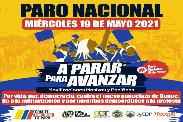 'El Paro continúa. Por la vida y la paz mantenemos la convocatoria a las más grandes y pacíficas movilizaciones para este miércoles 19 de mayo, con todos los protocolos de bioseguridad', convocó.