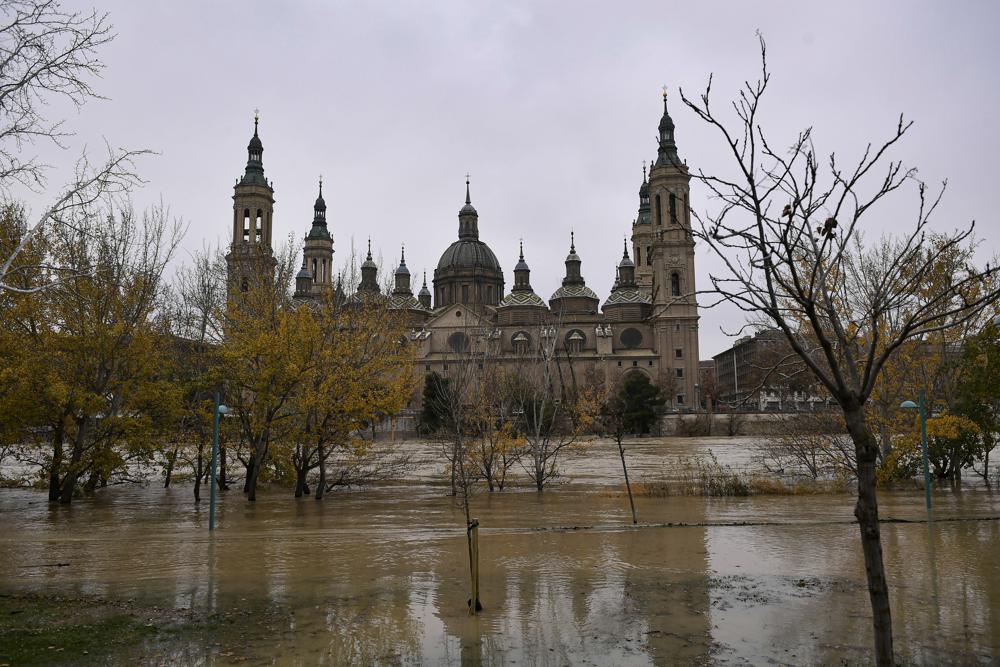 El río crecido atraviesa Zaragoza, una ciudad con unos 700.000 habitantes en el noreste de España. El agua ya ha sumergido grandes áreas de tierras agrícolas cercanas.