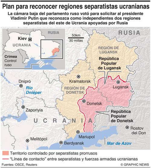 El pasado día 15, la Duma o cámara baja del Parlamento ruso le solicitó a Putin el reconocimiento de ambas entidades prorrusas.