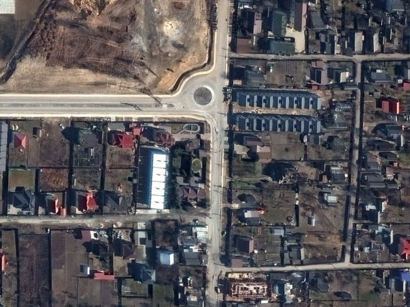 Sin embargo, las imágenes del satélite Maxar datan del 19 y 21 de marzo y muestran que los múltiples cuerpos ya estaban en esa calle para ese momento.