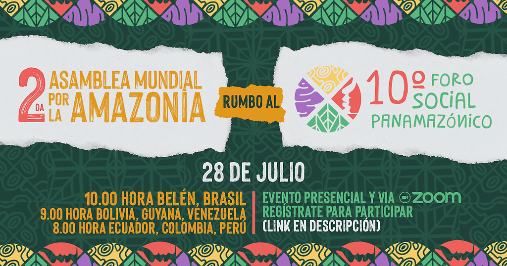 Los movimientos, redes, colectivos, activistas, instituciones y organizaciones de pueblos indígenas, quilombolas, ribereños, siringueros (caucheros), caboclos, marrons, campesinos, artistas, religiosos, defensores de la naturaleza, comunicadores, académicos, mujeres, jóvenes y pobladores de la Amazonía y de otras regiones del planeta comprometidos con la defensa de la vida, nos auto convocamos a la Segunda Asamblea Mundial por la Amazonía "Rumbo al X FOSPA" a realizarse de manera presencial y virtual el 28 de julio de 2022 en la ciudad de Belém do Pará Brasil a horas 8:00 de Ecuador, Colombia, Perú y Nueva York, 9:00 de Bolivia, Guyana y Venezuela, 10:00 de Brasil-Belém, Guyana, Guyana Francesa y Surinam, 15:00 de Francia (CEST) y 18:30 de India-Delhi.