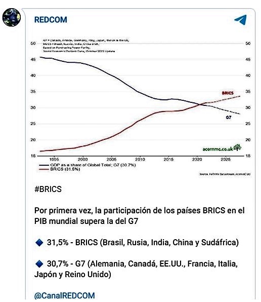 El sábado 11 de marzo, Redcom publicó una comparativa entre los PIB de los "Siete Grandes" (G7) y los BRICS. Donde los primeros representan el 30,7% del PIB mundial y los segundos el 31,5%. El gráfico comparativo ha sido publicado por el proveedor de datos de infraestructura y mercado financiero global estadounidense-británico, Acornmc.