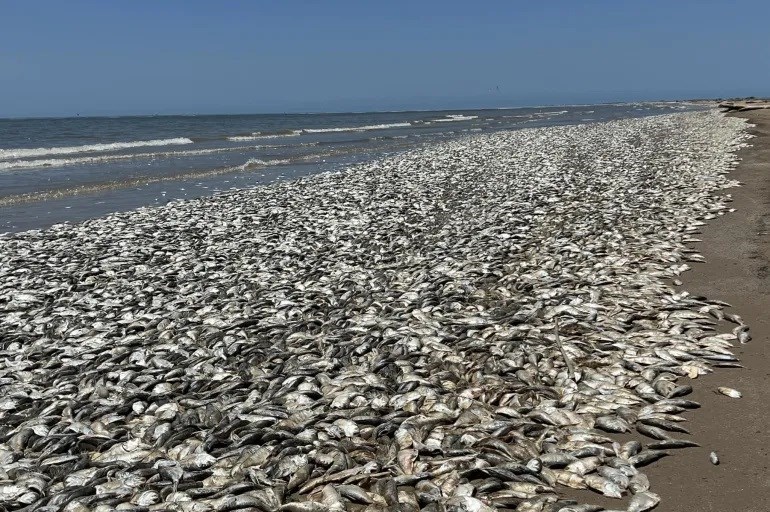 12 de junio de 2023.- Miles de peces muertos aparecieron en una playa de las costas del golfo de México en el estado de Texas, Estados Unidos, informaron las autoridades la semana pasada.