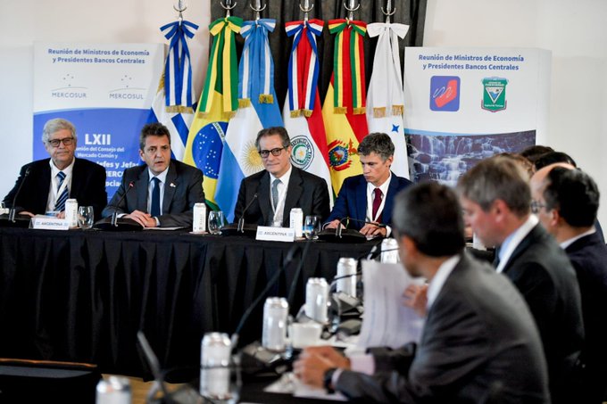 4 de julio de 2023.- Los ministros de Economía de los cuatro miembros del Mercado Común del Sur (Mercosur) —Argentina, Brasil, Uruguay y Paraguay— se reunieron el lunes en la ciudad argentina de Puerto Iguazú, en la provincia de Misiones, noreste del país, donde el titular argentino, Sergio Massa, planteó la necesidad de desdolarización en los comercios entre los miembros del bloque.