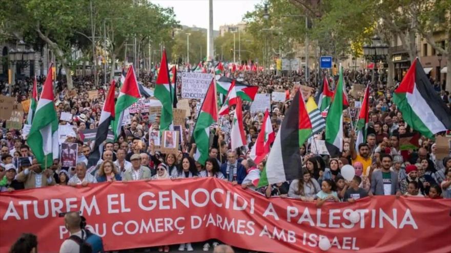 Las asociaciones propalestinas Comunitat Palestina de Catalunya y Coalició Prou Complicitat amb Israel, convocaron la marcha, a la que muchos se sumaron luciendo al cuello pañuelos palestinos, en reclamo al Gobierno español de Pedro Sánchez romper las relaciones con Israel.